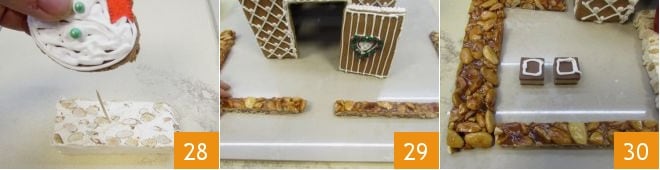 Stick a piece of nougat with a skewer to plant the snowman 28; place the door on the house and arrange the brittle fence around the house, leaving space inside for other decorations 29; then position the cremino chocolates and apply a little royal icing 30