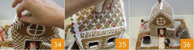 Then you can further refine the decorations of the roof and facade with royal icing tufts and colored smarties (34-35). Your gingerbread house will certainly be a masterpiece to show and enjoy with your guests 36!