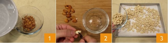 To prepare the fence, make the almond brittle: soak the almonds in hot water for a couple of minutes 1: this will make peeling easier: dry them before peeling and remove the outer skin with the tip of a knife 2. Line a baking sheet with parchment paper, distribute the peeled almonds on it 3, and toast them for 5 minutes in a preheated static oven at 350°F 3. The almonds should not darken.