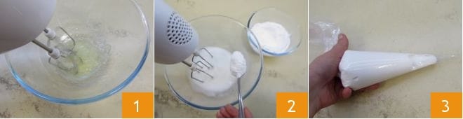 Prepare the royal icing you'll need for decorating the house and other elements. Pour the egg whites into a bowl with a few drops of lemon juice: this will help them whip better. Turn on the beaters 1 and when the egg whites are well whipped, gradually add the previously sifted powdered sugar into the bowl 2. Continue working the icing with the beaters until the powdered sugar is fully incorporated and you have a smooth, lump-free icing. Transfer the royal icing into two piping bags: a larger one with a plain tip for holding the parts of the house together and a smaller one for small decorations 3. Cut the tips to create a small hole only when you are ready to use the icing.