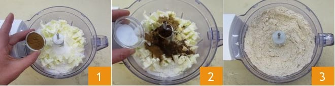 To prepare the gingerbread house, start with the dough: in the bowl of a mixer, add the sifted flour, granulated sugar, cold butter cut into pieces, and all the ground spices: cinnamon 1, ginger, nutmeg, cloves. Then add the baking soda and salt 2. Turn on the blades and create a sandy mixture 3,