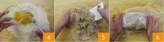 then turn it out onto the work surface and create the classic fountain shape: pour the honey and the eggs with the yolk in the center 4; mix with a fork initially, then knead by hand, without warming the dough too much 5, just long enough to form a compact mixture. Shape it into a slightly flattened disc and wrap it in plastic wrap 6. Let it rest in the refrigerator for at least 30 minutes.