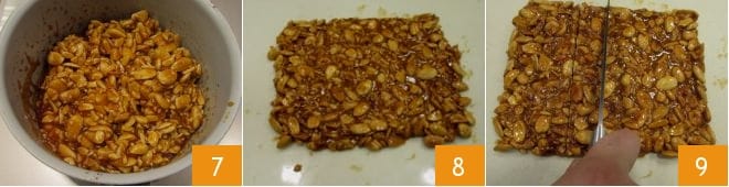 When the mixture is ready 7, pour it while still hot onto a silicone mat 8 or a baking sheet lined with parchment paper and level the surface. Let the brittle cool, but before it hardens completely, turn it out onto a cutting board and cut it into diamonds about 3/4 inch thick 9.