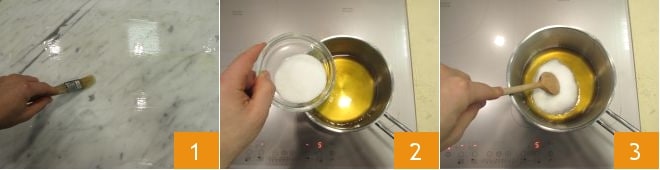 For the giuggiulena, prepare everything you need in advance because after cooking it is essential to work very quickly. So start by greasing a marble surface, or alternatively, a sheet of parchment paper placed on a heat-resistant surface 1. Then fill a container with cold water and keep a metal spatula or a sufficiently long smooth blade nearby. At this point, you can proceed to the preparation. In a steel (or copper) saucepan, heat the honey with sugar over medium heat 2 and stir until everything is melted 3.