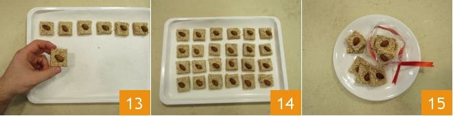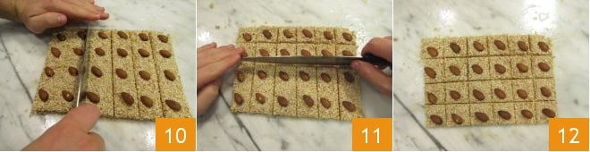 Finally, transfer the squares to a sheet of oiled parchment paper 13 and let them rest overnight at room temperature 14. The next day, your giuggiulena will be ready to be eaten or gifted in food bags 15.