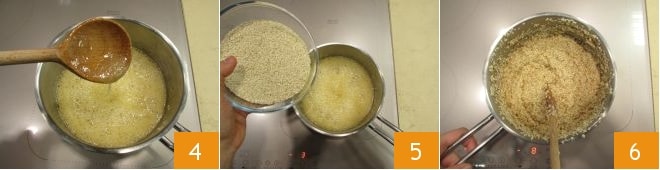 When the mixture is fluid and boiling 4, add the sesame seeds 5 and stir with a wooden spoon for 4-5 minutes. You must keep stirring continuously, making sure it doesn't burn at the bottom and especially on the edges 6.