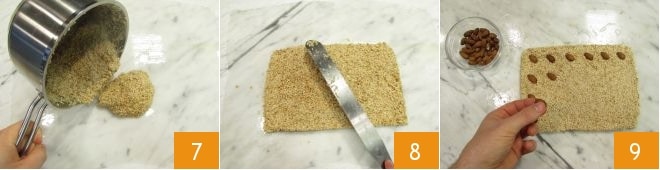 As soon as the mixture is combined, golden, and more compact, turn off the heat and immediately transfer it to the greased surface 7. Be careful not to burn yourself; use the wet spatula to level it until you get a rectangular slab about 0.39 inches thick, and carefully even out the sides 8. At this point, imagine dividing the slab into 24 squares of about 1.2x1.2 inches. Place an almond in the center of each of these 9.