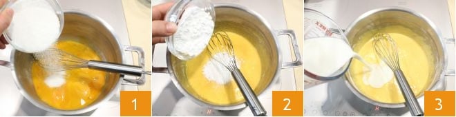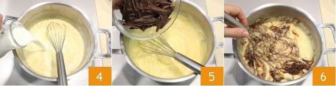 and the cream 4 while continuing to beat with the whisk to incorporate the ingredients. Heat the mixture and stir until the cream thickens. At this point, turn off the heat and add the chopped chocolate 5, mixing 6