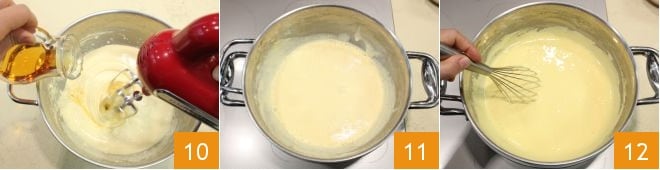 Then add the passito wine in a thin stream 10, still beating until it is well blended. Take a pot that can hold the double boiler, fill it with two fingers of water, and heat it on the stove, place the double boiler with the zabaglione cream on top 11, and heat for 10 minutes, always beating the mixture with the whisk 12.