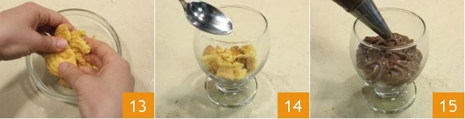 When the cream is puffy and thick, transfer the double boiler to a bowl full of ice to cool the zabaglione quickly. Now assemble the glasses with a capacity of about 7 ounces: roughly crumble the cornmeal cookies 13, then place a layer of crumbled cookies at the bottom of the glass 14, take the chocolate custard, transfer it to a piping bag with a star tip, and squeeze some cream into the glass 15,