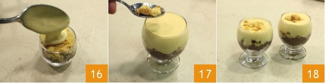 then make another layer of cornmeal cookies and finish with the zabaglione 16. Finally, garnish the glasses with crumbs of cornmeal cookies 17. Your glasses with cornmeal cookies, chocolate cream, and passito zabaglione are ready to be enjoyed 18!