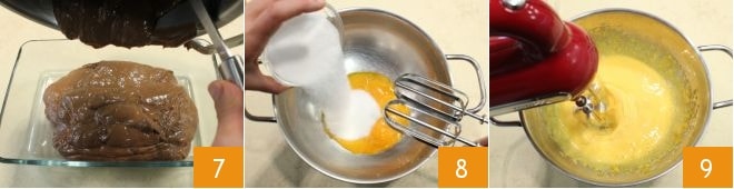 until it melts. Transfer the chocolate custard to a shallow, wide bowl 7, cover with cling film touching the surface, and let it cool. Now focus on the zabaglione: in a double boiler, place the egg yolks, add the sugar 8, and beat with an electric mixer 9 until you obtain a frothy and light mixture.