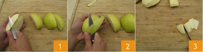 To prepare the gluten-free apple and blackberry cake, start by cleaning the apples. Cut them into quarters, remove the core 1, and peel them 2. Then slice them thinly, about 1/8 inch, and gradually place them in a bowl 3. You will get 7 oz.