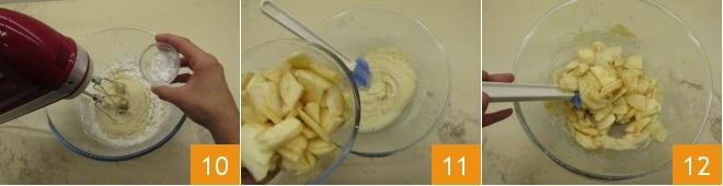 Finally, add the baking powder, and when it's incorporated, turn off the mixer 10. Add the apples to the mixture 11 and gently combine everything 12.