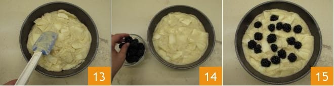 Pour the mixture into a greased 9-inch mold and carefully level the surface with a spatula 13. Then place the blackberries in the empty spaces 14 and proceed to baking 15.