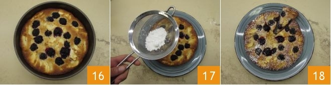 The gluten-free apple and blackberry cake bakes in a static preheated oven at 350°F for about 45 minutes 16. Once baked, let it cool completely before removing the cake from the mold and placing it on a serving plate. Once fully cooled, sprinkle your gluten-free apple and blackberry cake with powdered sugar if you like 17. The cake is ready, now you just need to taste it 18!
