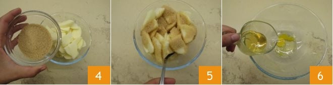 Sprinkle with cane sugar 4, mix, and set aside 5. Meanwhile, work on the batter: pour the egg and honey into a bowl 6.