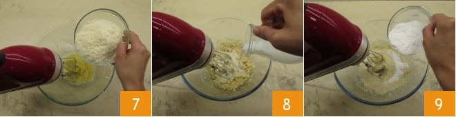 Turn on the mixer and let the egg whip slightly, then add the almond flour in sequence 7, followed by the milk 8 and the rice flour 9.