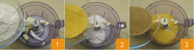 To make the gluten-free shortcrust pastry, place the cold butter in pieces, the rice flour 1, the corn flour 2, and the brown sugar 3 into the bowl of a food processor with blades.