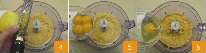 Flavor the dough with lemon zest 4 then add the egg yolks 5 and the whole egg 6.