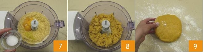Finally, add a pinch of salt 7, then start the mixer to obtain a homogeneous and soft mixture 8. Transfer it to a lightly floured work surface, knead with your hands to compact it, and form a dough ball 9. Wrap the dough in plastic wrap and place it in the refrigerator to firm up for at least 2 hours before rolling it out and using it in your recipes.