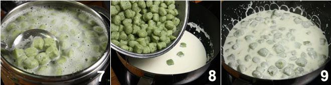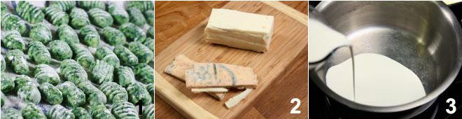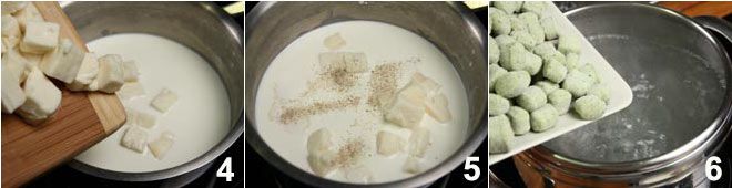 Prepare the spinach dumplings 1 following our recipe found by clicking here. Remove the rind from the taleggio and cut the cheese into pieces 2; pour the cream into a pan 3