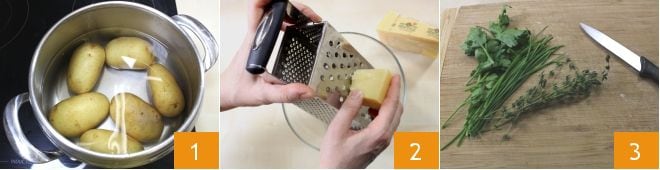 To prepare the herb dumplings stuffed with Sbrinz, wash the potatoes and boil them whole with the skin in lightly salted water 1. Meanwhile, grate 150g of cheese 2 and cut 50g into small cubes. Finely chop the aromatic herbs together 3.