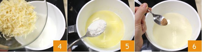 While the potatoes are cooking, prepare the Sbrinz sauce that will be used to season the dumplings: heat the milk (or cream) in a small pot and add the Sbrinz 4. Melt everything and sprinkle in the flour 5, then wait for the sauce to thicken and add the pepper, nutmeg 6. Adjust the salt if necessary and set aside.