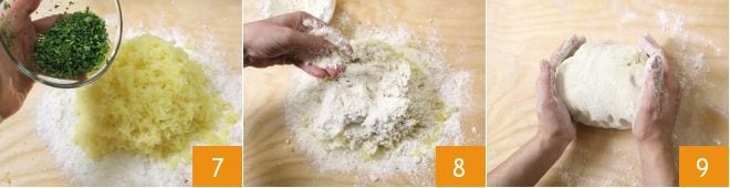 Drain the potatoes when they are cooked and let them cool for 5 minutes, then peel and mash them with a food mill. Place the obtained purée on a work surface where you have spread half of the total flour, and add about 0.35 oz of chopped aromatic herbs and salt 7. Cover with the rest of the flour 8 and knead until you form a homogeneous dough 9.