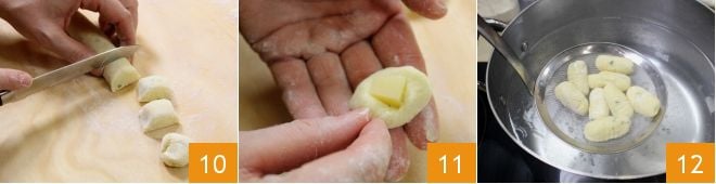 Shape the dough into logs and cut them into cubes 10, filling each one with a small piece of Sbrinz 11 and then roll them on a ridged board to give the traditional shape to the dumplings (alternatively, you can use the prongs of a fork). Drop the dumplings (one portion at a time) into plenty of boiling salted water 12.