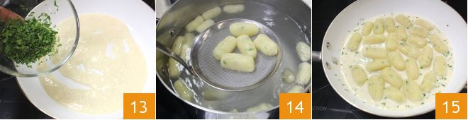 Reheat the Sbrinz sauce and add the other chopped aromatic herbs 13, about a tablespoon, but you can increase or decrease the amount according to your taste. When they float to the surface, drain them 14 and place them directly in the pan with the Sbrinz sauce 15. Your herb dumplings stuffed with Sbrinz are ready!