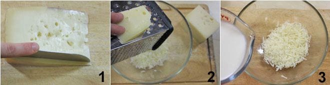 To prepare the gnocchi with Asiago cream, start by preparing the cream: take the Asiago and remove the rind 1, grate it 2 and soak it in milk for 20 minutes 3.