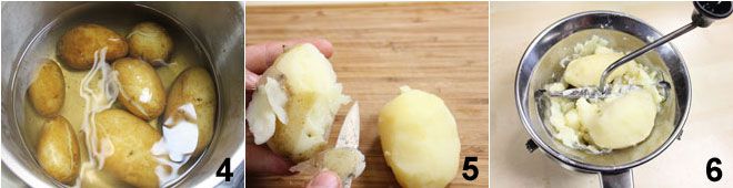 In the meantime, prepare the gnocchi. Wash the potatoes and cook them with the skin in a pot of salted water 4. Once they are cooked, drain them and, while still hot, peel them 5. Mash them with the help of a food mill or potato masher and place them in a large bowl 6,