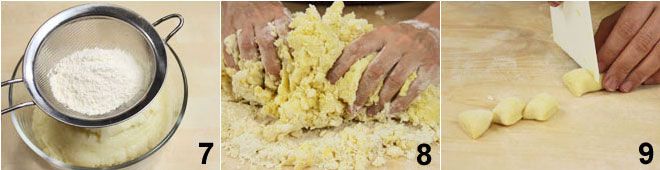 then add the sifted flour and a pinch of salt 7. Transfer the dough to a work surface for easier handling and knead until you obtain a homogeneous mixture (if needed, add more flour to the mixture to make it easier to work with) 8. At this point, let the dough rest at room temperature for 10 minutes. After the necessary time, divide it into many logs and cut pieces about 1 inch thick 9,
