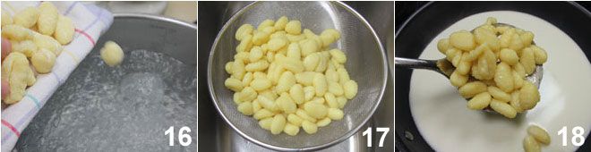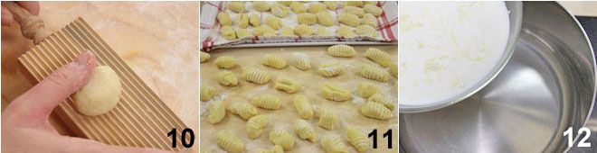 then start forming your gnocchi using the appropriate gnocchi board 10, finally place them on a floured surface or tray before cooking them 11. At this point, take the Asiago with the milk and put it in a saucepan, then bring it to a boil 12.