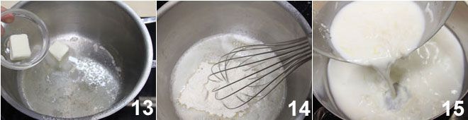 Meanwhile, take a saucepan, melt the butter 13 and incorporate the flour with the help of a whisk 14. When the Asiago and milk mixture reaches a boil, add it to the butter and continue stirring with the whisk to blend all the ingredients 15. As soon as the cream thickens or boils again, remove it from the heat. At this point, taste it and adjust the salt if necessary.