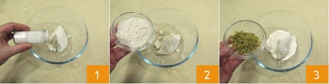To prepare the ricotta gnocchi with three aromas, start with the gnocchi dough. In a large bowl, add the ricotta and season it with pepper and salt 1. Then incorporate the sifted flour 2 and finely chopped green olives 3.