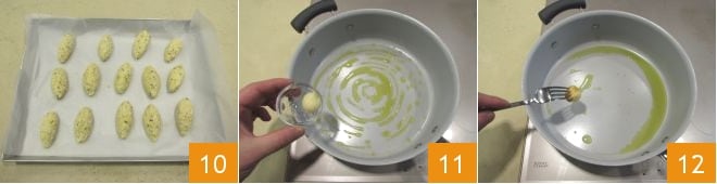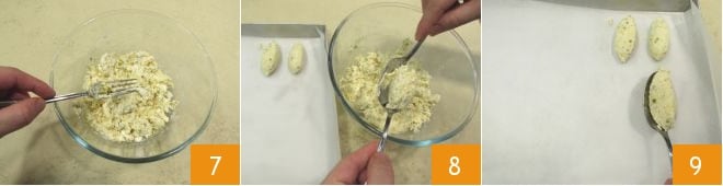 It's time to mix well with the help of a fork to obtain a homogeneous dough 7. Using two tablespoons, take a small amount of dough (about 0.7 oz) and shape it into a quenelle 8, which is an almond-shaped gnocchi; then gently place it on a tray previously lined with parchment paper 9.