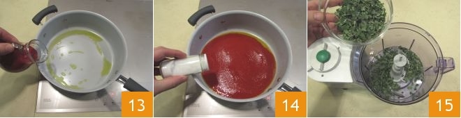 In the flavored oil, now pour the tomato passata 13 and season with salt and pepper 14. Continue cooking for about 20 minutes, and in the meantime, prepare the pesto. In the mixer glass, pour the washed and dried marjoram leaves 15