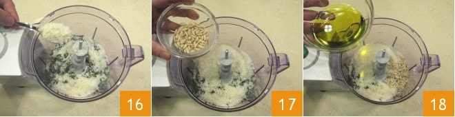 Add the grated cheese 16, the pine nuts 17, and the extra virgin olive oil 18