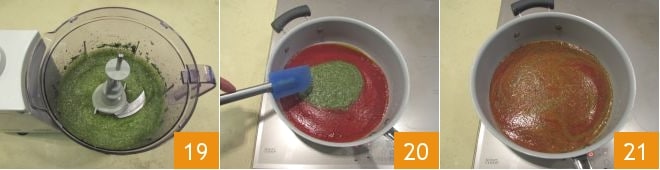 Then turn on the mixer and blend into a cream 19. Incorporate the obtained pesto into the sauce 20, which in the meantime will be ready. Set aside only a small amount of pesto to garnish the dishes. Mix the pesto well into the sauce, and keep warm 21.