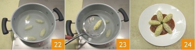 Bring a pot of plenty of salted water to a simmer. Before it reaches boiling temperature, dip the gnocchi 22 and cook them for about 3 minutes. Gently drain them 23 and arrange them like petals on dishes on which you have poured a few tablespoons of hot sauce. In the center, place a few drops of marjoram pesto. Your ricotta gnocchi with three aromas are steaming and ready to be served 24!