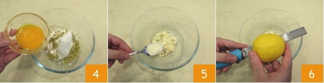 At this point, also add the slightly beaten egg yolks 4 and mix. Add the grated Grana cheese 5 and the grated zest of half an untreated lemon 6.