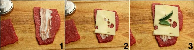 First, prepare the potato gnocchi according to the recipe you will find by clicking Potato gnocchi. Once ready, place them on a tray covered with a lightly floured cloth and keep them in a cool place. Meanwhile, lightly pound the meat slices (if they are too large, cut them in half) and on each, place a piece of bacon 1, a piece of cheese 2, two sage leaves 3, and pepper.