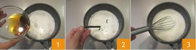 To prepare the golden milk ice cream, pour the coconut milk into a saucepan, add the maple syrup 1 and flavor with the vanilla seeds and pod 2. Bring the mixture to a boil, stirring with a spatula or a whisk 3.