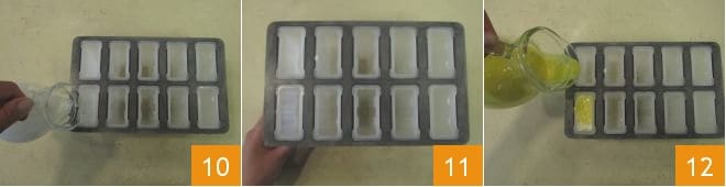 Take an ice pop mold with a capacity of about 2.4 oz for each stick, and fill it with the white mixture, distributing it evenly among 6 compartments 10, then place the mold in the freezer for about 10 minutes. After this time, take the mold 11 and pour the spiced mixture over the white one 12.