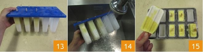At this point, cover with the lid, insert the sticks 13, and let it set in the freezer for at least 5 hours. When removing the ice creams, briefly run the mold under warm water to facilitate the operation 14 and enjoy your golden milk ice cream for a rejuvenating break 15!