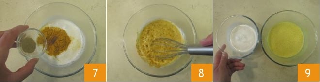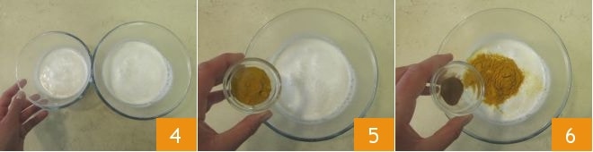 Remove the saucepan from the heat, discard the vanilla pod, and divide the mixture into two parts, one of 150 g (5.3 oz) and one of 300 g (10.6 oz) 4. In the 300 g bowl, add the turmeric 5, and the cinnamon 6