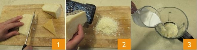 To prepare the Grana cheese flan with chanterelle mushrooms, start by cutting the Grana to remove the rind 1. Grate it 2 and place it in the jug of a blender. Pour in the cream 3,