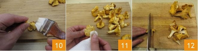While the Grana cheese flans are cooking, clean the chanterelle mushrooms: gently brush the underside of the cap to remove traces of dirt between the folds 10 and clean them with a soft cloth 11. Then cut them in half 12.